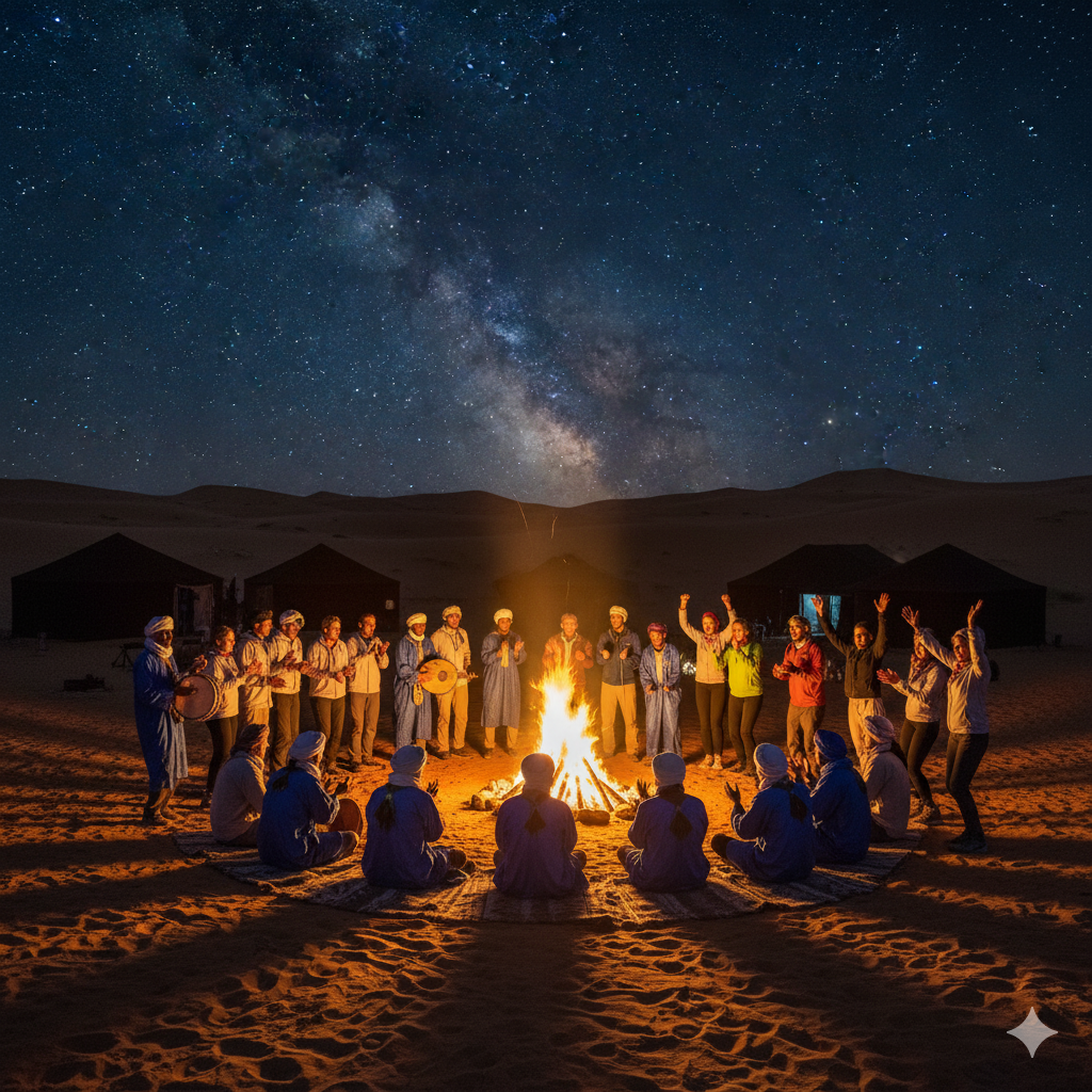 Late afternoon camel trek into the Erg Chebbi dunes — watch the sunset from the top of the dunes. Overnight in a Berber camp (private or shared tent). Dinner and campfire entertainment included.